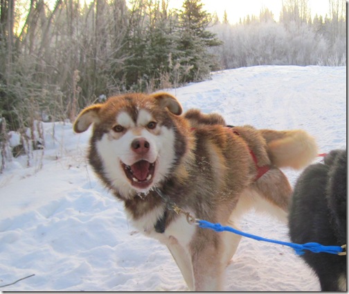 Bucko is a youthful, happy-go-lucky type of guy. He enjoys the luxury of the couch, lots of hugs and kisses, and quite a few treats. We have found over the years that the more a malamute is incorporated into regular family life, the better lead dog he turns out to be, and that is the case with Bucko. He has all the traits of a great expedition leader: attentive, athletic, small-framed, large lung capacity, and efficient metabolism. He’s had two arctic expeditions under his belt, and now that he’s four years old, we’re trying him out in lead. He’s doing great!! Bucko is very eager to run in front.